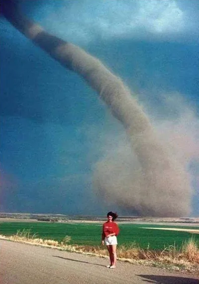 Жительница Небраски Одра Томас фотографируется в тот момент, когда торнадо несётся по направлению к ее ферме. США, 1989 год НАУКА И ФАКТЫ