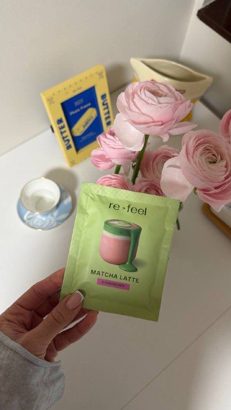 Очень вкусная матча с клубникой от refeel . Заливаю чуть кипятком порошок , перемешиваю и после уже горячее взбитое кокосовое молоко добавляю . Ням!