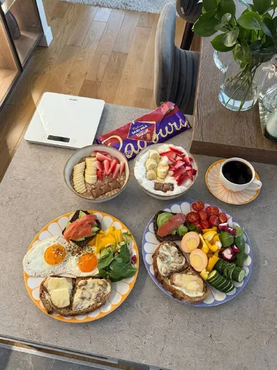 Дооооброе утро ❤️🔥 и любимый вид доброутреннего до/после 🤩 Есть подозрение, что завтраки Ильи лидируют в плане фотогеничности 🤣 этот красивущий омлет, эта веселая овсянка 🥣 M&m’s в кашу приколь