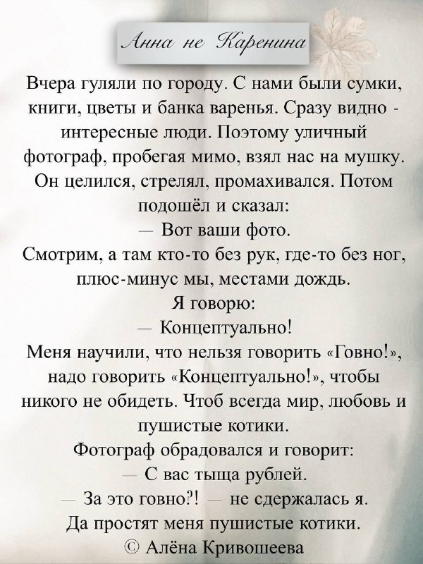 И вдогонку. В одной компании мужчины советуются, что подарить дамам на 8 Марта... Решили: КОСМЕТИКУ. Деньги выделили по статье: "РЕМОНТ ФАСАДА и ВЫВЕСКИ" Бухгалтер подписала...🤣 📝Анна не Карени