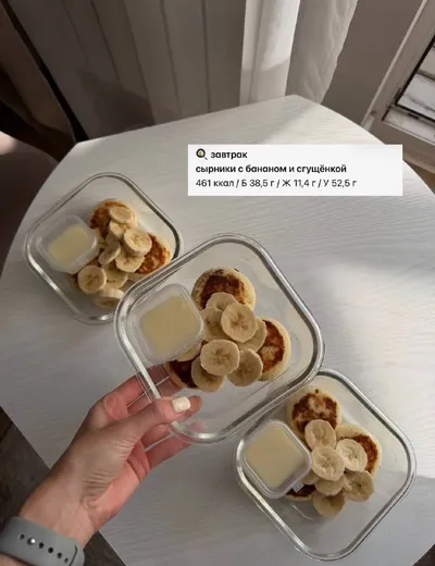 рецепты блюд ⬇️ предлагаю приготовить и закрыть вопрос с едой на несколько дней!) 🍳 завтрак сырники с бананом и сгущёнкой 461 ккал / Б 38 г / Ж 11 г / У 52 г ингредиенты на 3 порции (в скобках расч