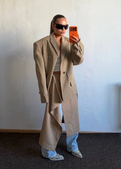 Юбка и жакет, которые собирают образ без лишних усилий. Юбка на запах — про мягкость и движение. Простое полотно, обернутое вокруг тела и зафиксированное минимальными деталями. Жакет — наоборот, доб