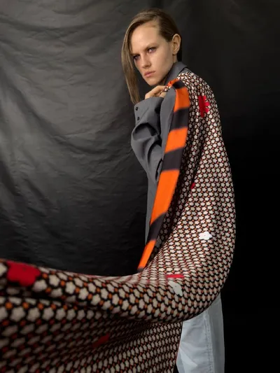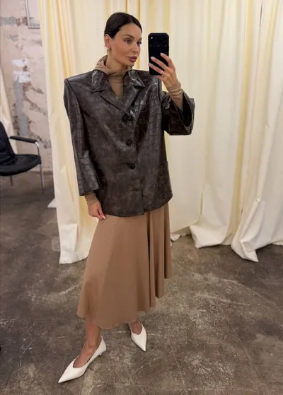 На первый взгляд классический пиджак, но за счёт экокожи с фактурой рептилии он работает и как полноценная верхняя одежда. Прямой силуэт, акцент на плечи и смещённый вперёд рукав создают ощущение дв