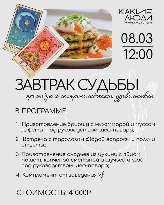 Арт-вечеринки и кулинарные мастер-классы от пространства событий «Какие люди» 🎨 🗓️ #8_марта, 12:00 «Завтрак судьбы»: прогнозы и гастрономические удовольствия Участники приготовят праздничный бранч,