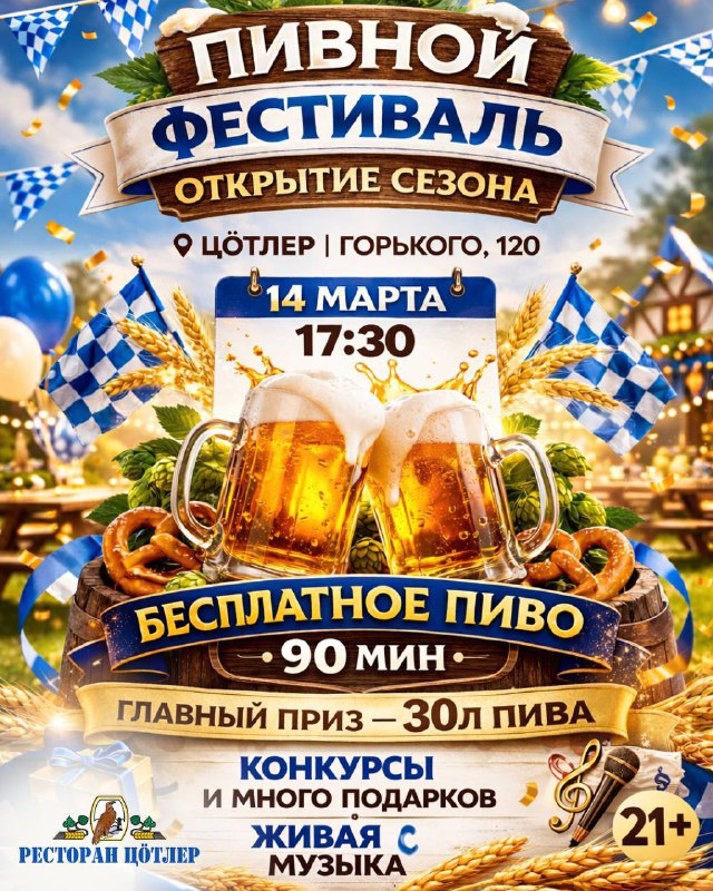 В субботу в ресторане ЦÖТЛЕР грандиозно откроют сезон пивным фестивалем 🍻 🗓️ #14_марта, 17:30 📍 Калининград, Горького, 120 В прошлом году было мощно, в этом году будет ещё громче: 🔸 90 минут б
