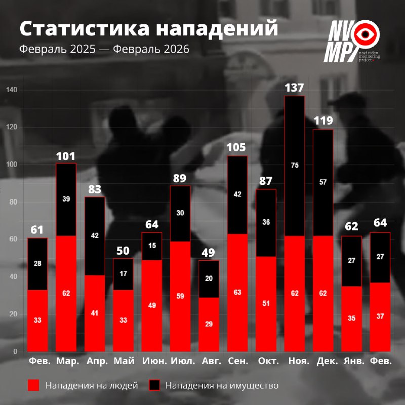 Данные за февраль 2026. Спад количества видео на фоне нападений на образовательные учреждения В феврале нами было заархивировано 36 видео, на которых были зафиксированы 64 нападения: 37 на людей и 27