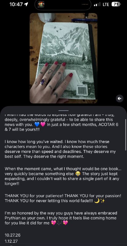 Ребятааааа 🥹 Сара Маас анонсировала 6 и 7 части «Королевства шипов и роз»!! В посте 27.10.2026 и 12.01.2027 как даты выхода Ждём!
