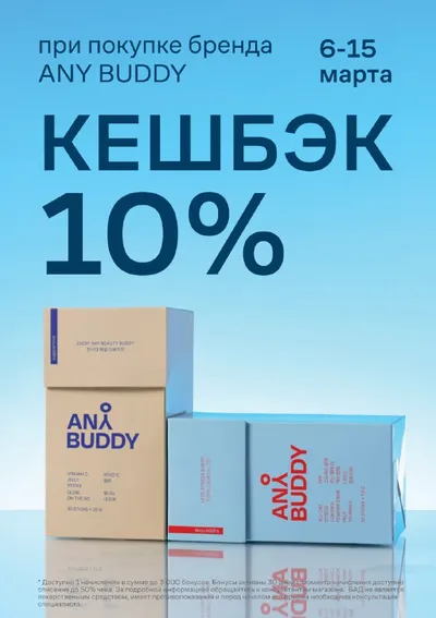 Мы решили порадовать тебя перед 8 марта и подготовили сюрприз 🩵 С 6 по 15 марта при любой покупке ANY BUDDY ты получишь повышенные 10% бонусов на карту лояльности @goldapple Подробности акции