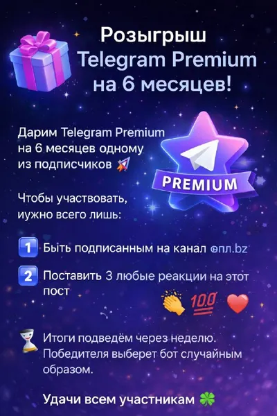 🎁 Розыгрыш Telegram Premium на 6 месяцев! Дарим Telegram Premium на 6 месяцев одному из подписчиков 🚀 Чтобы участвовать, нужно всего лишь: 1️⃣ Быть подписанным на канал эпл.bz 2️⃣ Поставить 3 люб