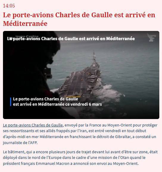 🇫🇷⚡️Французский авианосец «Шарль де Голль» прибыл в Средиземное море на фоне конфликта на Ближнем Востоке, — AFP. Там он будет участвовать в «обеспечении безопасности граждан Франции и ее союзников