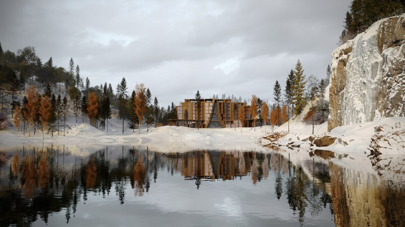 Отель в Карелии, спроектированный архитектурным бюро Chado, вырастает из ландшафта в образе гигантского валуна, расколотого надвое. В центре этой композиции рождается драматичное общественное простран