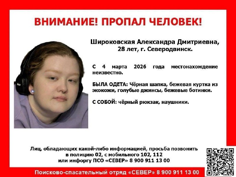 В Северодвинске пропала молодая девушка 📲 Александра Широковская пропала 4 марта. Всю информацию просят сообщать в полицию по номерам 102, 112 или на горячую линию ПСО «Север» 89009111300. Оставайт