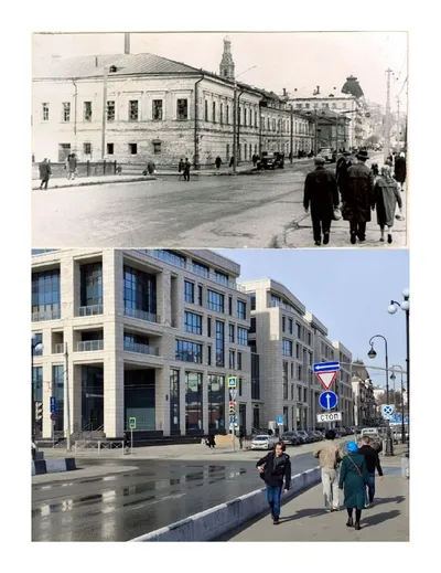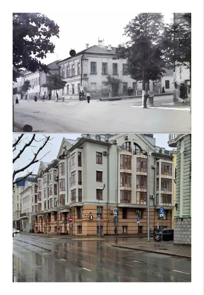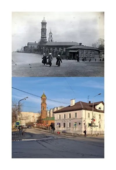 Угол бывших Черноозёрской и Поперечно-Казанской улиц (ныне Дзержинского и Япеева). Здание по центру чёрно-белого кадра и следующее за ним уже встречались в нашем канале: это флигель и главный дом Ибра