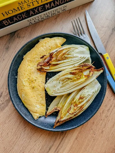 Это мой завтрак сегодняшний. Омлет с запечённым в аэрогриле эндивием или салатным цикорием. В той же Барселоне пачка эндивия всегда в моей продуктовой корзине, в Москве мне его не хватает. Поэтому ог