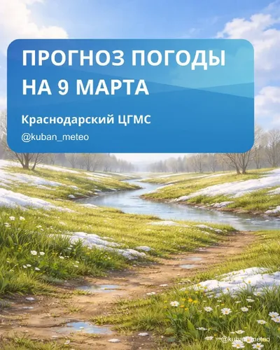 ☁️⛅⛈️ 🌤️Понедельник, 9 марта 📍 Краснодарский край Небольшая облачность. Без осадков. 💨 Ветер западной четверти 3–8 м/с. 🌡 Температура воздуха: ночью +2…-3°, местами в юго-восточных районах -2…-