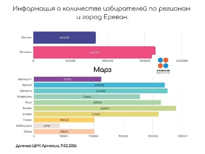 Информация о количестве избирателей по регионам и Ереван. Всего избирателей: 2 489 031 челове по состоянию на 11.02.2026 по данным ЦИК Армении. Ознакомьтесь с короткой памяткой о том, кто может голо