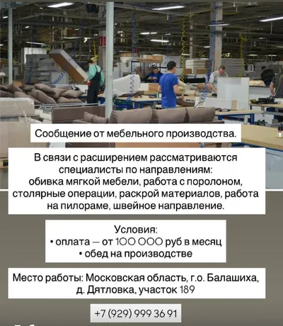 В рамках расширения мебельного производства рассматриваются специалисты по следующим направлениям: • Обивщик • Поролонщик • Столярщик • Закройщик • Пилорамщик • Швея Условия: • Оплата труда — от 100