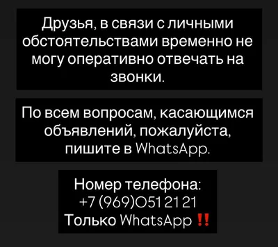 Друзья, в связи с личными обстоятельствами временно не могу оперативно отвечать на звонки. По всем вопросам, касающимся объявлений, пожалуйста, пишите в WhatsApp. Номер телефона: +7 (969)051 21 21