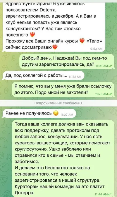 Иногда (раз в пару месяцев) получаю такое сообщение. Что подписалась в Дотерру по вашим наводкам, все беру, все нравится. Но хочется ещё комьюнити, бизнес-клуб, клубы с протоколами и так далее… Но