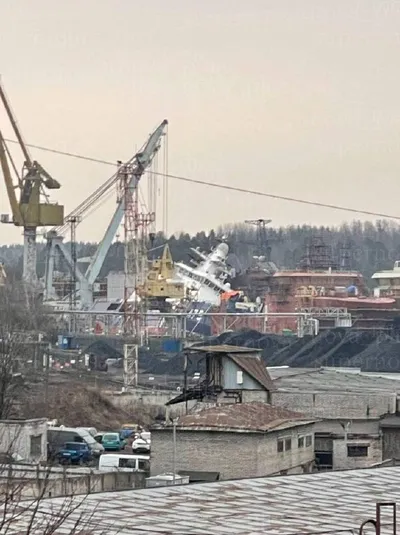 В порту Выборга после атаки украинских дронов (пока предположительно) тонет один из российских кораблей.