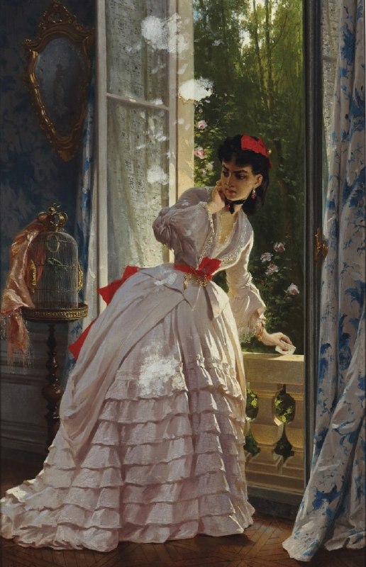 «Тайное письмо», Пьер Франсуа Эжен Жиро (середина XIX века) На этой картине можно наблюдать молодую, богато одетую женщину, которая передаёт за окно конверт, тревожно оглядываясь. Возможно, за окном