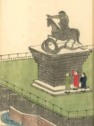 «Медный всадник» по версии японского художника, которому «туристы» описали памятник. В 1793 году японцы попали в шторм близ Алеутских островов. Выживших моряков обнаружили русские и перевезли сначал