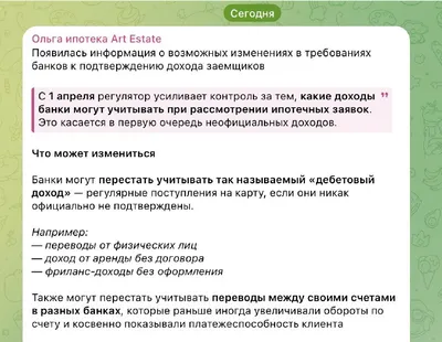 ⚡️Ипотека только для «белых»: ЦБ меняет правила выдачи кредитов с 1 апреля. Такое сообщение сегодня мы получили от нашего ипотечного брокера Ольги. ЦБ запрещает банкам учитывать при оценке заемщика с