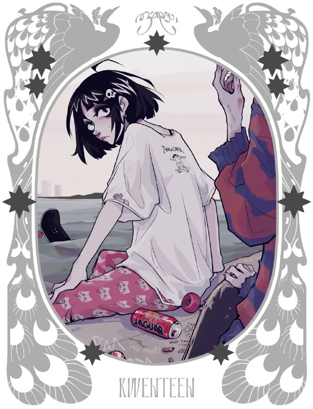 Наш участник, пропитанный духом русреала как никто иной - kwenteen. Его эстетика - цветастые банки энергетиков и сигаретный дым. А ещё у него можно урвать много-много стикеров по «Пошлой Молли»! ✨ Фан