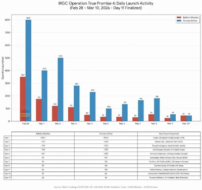 Статистика запусков ракет и БПЛА Ираном по дням. Позавчера был антирекорд, но вчера Иран снова смог запустить 45 ракет, что примерно на среднем уровне не считая первых дней, зато антирекорд по БПЛА.