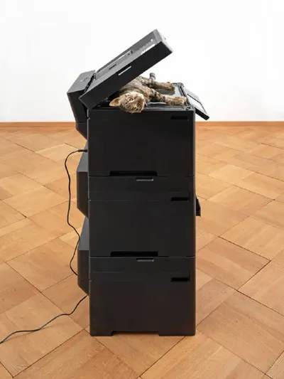 Eva & Franco Mattes Copycat, 2024 Художники создали чучело кота и поместили его в галерее на принтер. Каждый желающий мог нажать на кнопку копирования и распечатать себе изображение кота на разноцвет