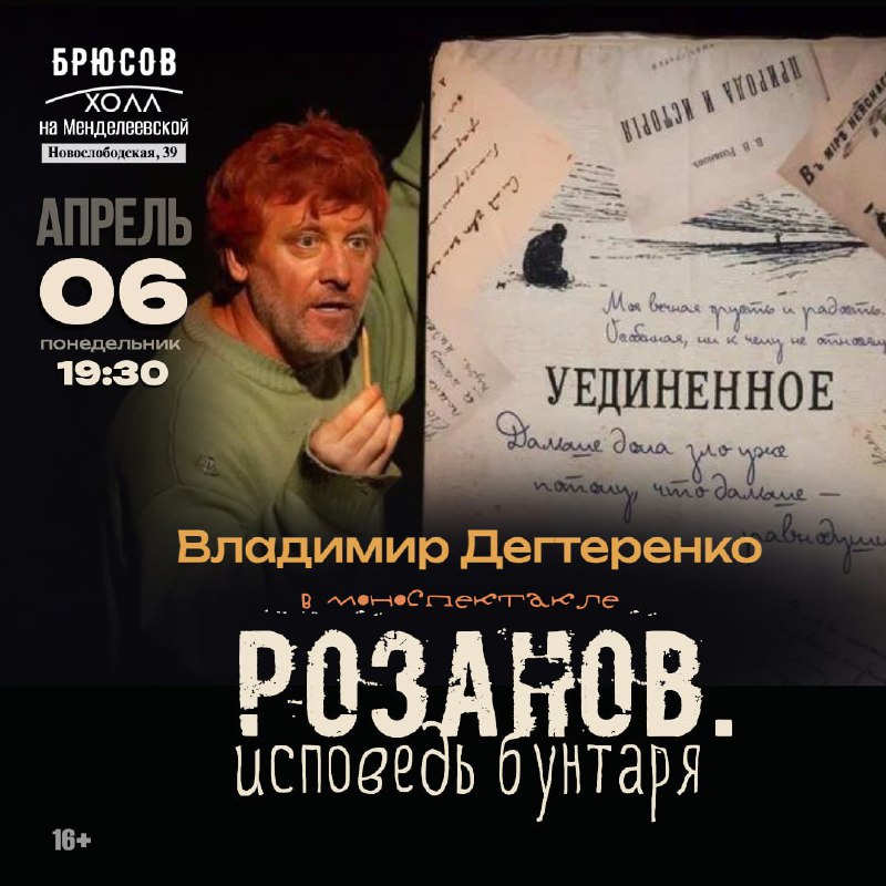 ⚡️Новости 🔡🔡🔡🔡🔡 🔉 Режиссер и актёр киножурнала «ВСЛУХ!» Владимир Дегтеренко приглашает на свой моноспектакль «Розанов. Исповедь бунтаря». 🎙История в жанре философской притчи про «первого блог