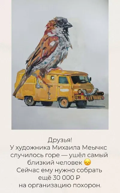 Дорогие друзья, мы уже не раз рассказывали о художнике Михаиле Меычкс и его работах. Сейчас у него случилось тяжёлое личное горе, и на организацию похорон осталось собрать 30 000 ₽ — это критически
