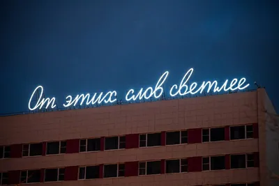 В Астрахани на крыше отеля установили двадцатипятиметровую неоновую инсталляцию «От этих слов светлее», автором которой стал художник Владимир Абих. Художник специально стилизовал шрифт под старую с