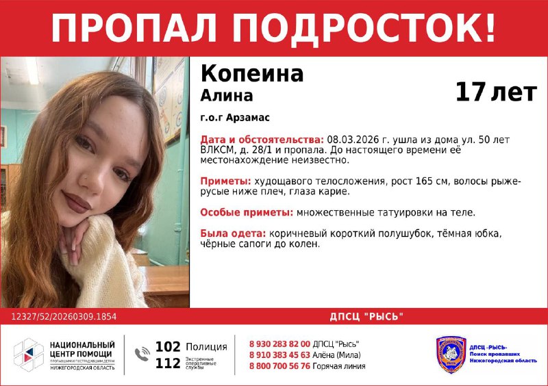 Пропал подросток! Помогите, пожалуйста, распространить информацию! Копеина Алина, 2009 г.р., г.о.г Арзамас 📍Подпишись: Все новости Арзамаса раньше всех без интернета 🇷🇺 - https://max.ru/arz1578