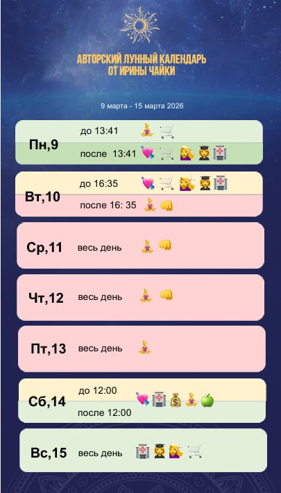 🌙 Лунный календарь на неделю с 9 марта 2026 по 15 марта 2026 🌙 Понедельник, 9 марта — 21-е л.с., Луна в Скорпионе, Накшатра Вишакха → Анурадха до 13:41 — хороший день после — сильный день Что хорош