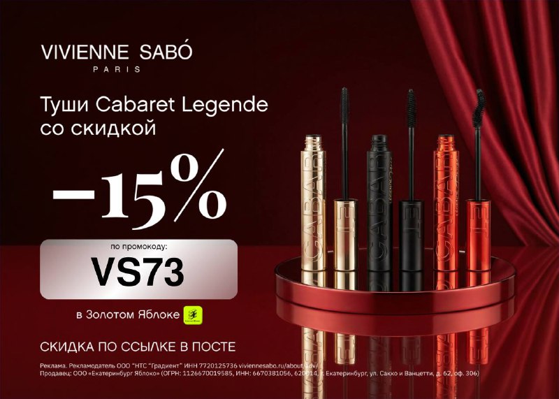 Любимая тушь со скидкой в Золотом Яблоке! 🤩 Удобная щеточка, которая сделает неотразимый взгляд — вот секрет идеального макияжа от Vivienne Sabó и тушей Cabaret Legende. Не осыпаются, не склеивают р