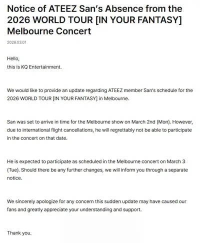 𝐈𝐍𝐅𝐎 Уведомление об отсутствии Сана из ATEEZ на концерте в Мельбурне в рамках тура 2026 WORLD TOUR [IN YOUR FANTASY] Здравствуйте. Это KQ Entertainment. Мы хотели бы сообщить обновлённую информ