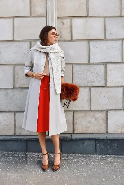 Ирина Логвинова (@kultiralog) в плаще «Енисей» из бежевого хлопка с водоотталкивающей пропиткой в рубрике #мояМару • Плащ ATELIERMARU • Юбка PRADA • Сумка PRADA • Туфли MIU MIU • Бусы мамы Ирины Логв