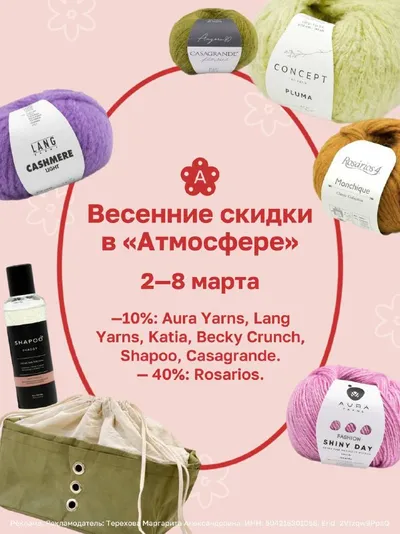 Весенние праздники в «Атмосфере»🌷🌷🌷 2 марта заходите на сайт и в студию на первую волну праздничных скидок😍 —10%, 2—8 марта: Aura Yarns, Lang Yarns, Katia; —10%, 6—8 марта: Becky Crunch (кроме