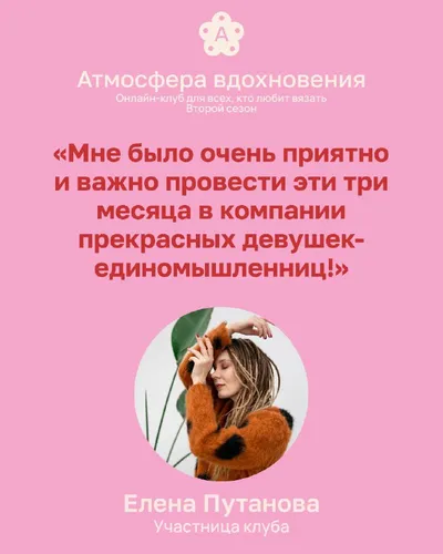 «Я бы сказала, что первый сезон превзошёл мои ожидания!», Елена Путанова, @klubochekshersti🌸 Елена — участница первого и второго сезонов нашего клуба «Атмосфера вдохновения». Лена была с нами в перв