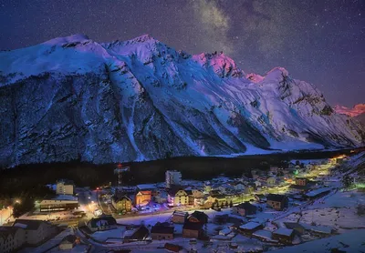 Волшебная ночь в Приэльбрусье. Посёлок Терскол под одеялом из миллиардов звёзд ✨ Кабардино-Балкария 📸: @Forbidden_Mountains 📍Координаты: Яндекс Карты Атмосфера России 🌷