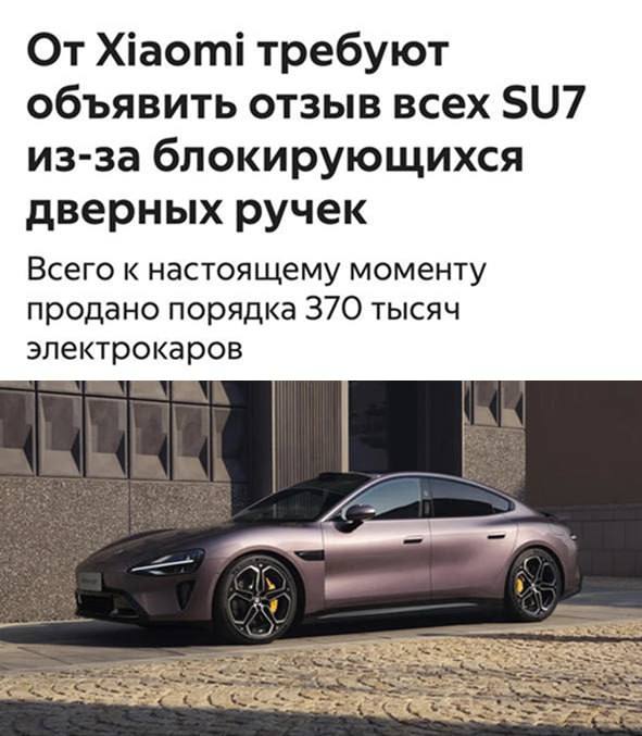 В Китае призвали к отзыву всех Xiaomi SU7 Причина — электродверные ручки: после аварии и отключения питания они могут блокироваться, что осложняет доступ в салон. Речь идёт примерно о 370 тыс. выпущ