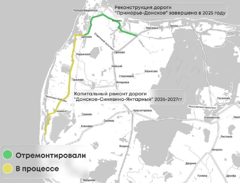 В этом году запланирован капитальный ремонт автодороги «Донское-Синявино-Янтарный» Мининфраструктуры ищет подрядчика. Должны обновить дорожное покрытие, привести в порядок остановки, тротуары и осве