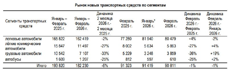 Данные по продаже новых автотранспортных средств в России по итогам февраля 2026-го. Информация: Минпромторг РФ