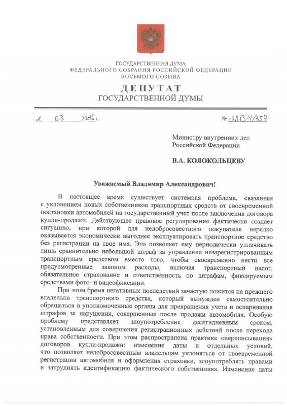 Депутаты ГД Лантратова и Миронов вчера направили предложения министру внутренних дел Колокольцеву: изменить порядок оформления продажи автомобилей. Самое главное: депутаты хотят обязать продавцов в т