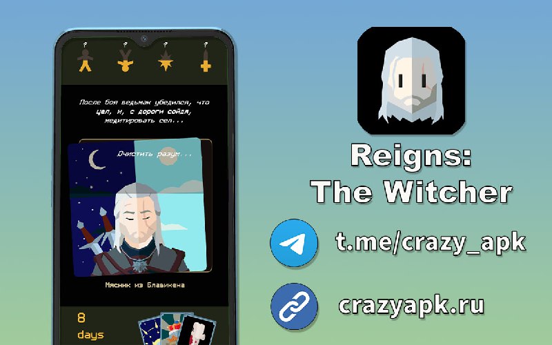 🔸Reigns: The Witcher 🔹Версия: 1.0.3616 Мрачная карточная игра, где каждый свайп решает судьбу. Станьте Геральтом из Ривии и балансируйте между королями, чудовищами и иронией Лютика. Моды: куплена