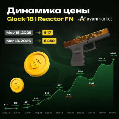 📈 Пока все ждут Cache, Glock-18 Реактор активно растет в цене! Почти за год он вырос на 1424%, причем основной рост пришелся на последние полгода. Некоторые скины из коллекции Cache тоже постепенно