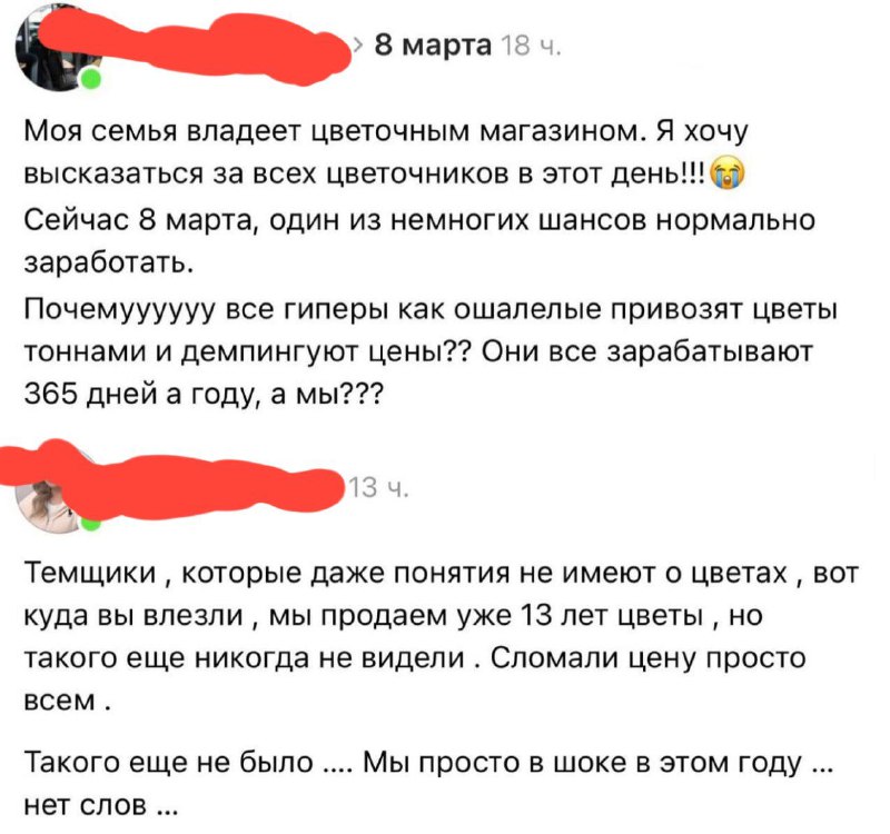 💐 Цветочники не досчитались выручки на 8 марта Владельцы цветочных магазинов жалуются: гипермаркеты в этом году завалили прилавки цветами и обрушили цены. «Темщики, которые даже понятия не имеют о