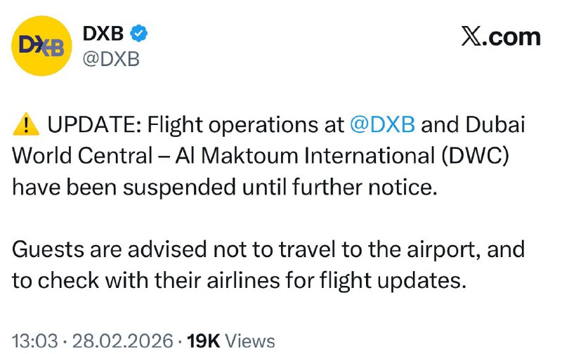 ❗️Крупнейший хаб – международный аэропорт Дубая сообщил о прекращении работы «до дальнейшего уведомления». Пассажирам рекомендуется уточнять детали у перевозчиков и не приезжать на территорию авиага