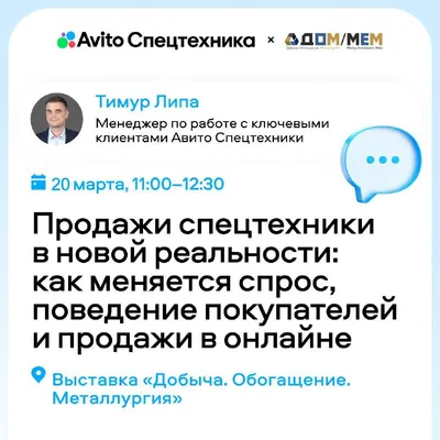 🤍 Авито Спецтехника выступит на конференции «Добыча. Обогащение. Металлургия» @memexpo_sibir С 18 по 20 марта в Новосибирске будет проходить международная выставка-форум, посвящённая оборудованию и